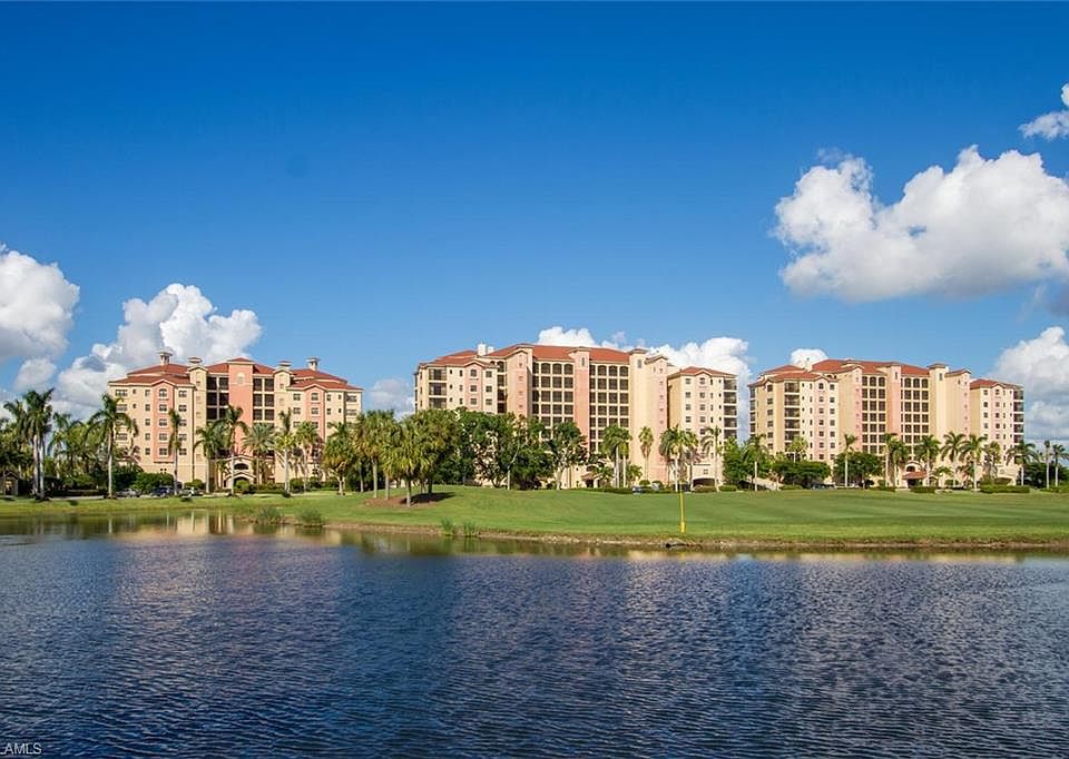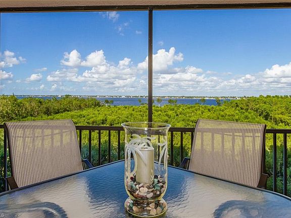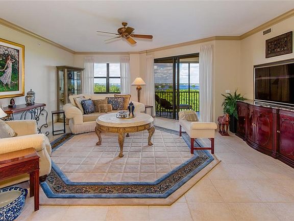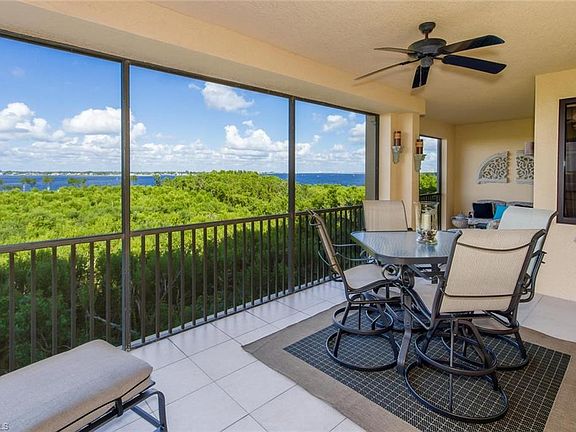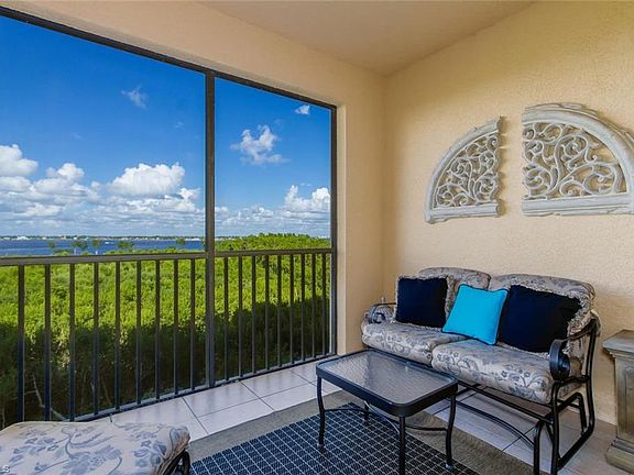 Enjoy River views from this meticulous 4th floor condo. Open floor plan with 2,510 SF of luxury living offers 2 bedrooms, 2.5 baths, and a den. Spacious kitchen with granite countertops, Stainless Steel appliances, center island, breakfast bar, and breakfast nook. Master bath with two sinks, large walk in shower, and tub. Master bedroom offers a large walk in closet and a sitting area. Crown molding, solid wood core doors, custom window treatments, tile in all living areas are just some of the quality features found in this home. Private oversized 2 car garage offers plenty of room for storage. Palmas Del Sol residents enjoy a private clubhouse with full kitchen, pool table, conference room, heated lap pool/spa, outdoor grills and a community workshop. Private equity memberships are available for purchase. Great Location close to shopping, dining and 5 miles to Sanibel Island Causeway and Fort Myers Beach! Foyer chandelier is excluded from the purchase.
