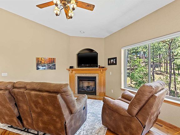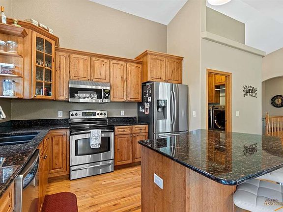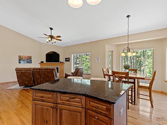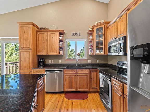 Listed by Cheri St. Pierre, Lead Realtor - Keller Williams Realty Black Hills (605) 390-2481. Superb curb appeal in this open concept walkout ranch perfectly nestled on over 3 wooded acres, just 15 minutes from town! Lovely kitchen with loads of custom hickory cabinets, heaps of granite countertops, center island, stainless steel appliances, and spacious dining room with walkout to a great-sized deck. Open living room with vaulted ceiling, cozy gas fireplace & fantastic window display. Luxurious master suite with full master bath highlighting a double vanity, jetted tub, walk-in shower & walk-in closet with organizers. Another good-sized bedroom, full bathroom & handy main floor laundry. Walkout basement features a sprawling family room with access to a patio space, 3rd bedroom with walk-in closet, 3rd full bathroom & storage room. Attached 3 stall garage, pristine landscaping, and chock full of pine trees.