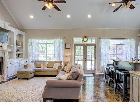 Beautiful home with large porch, has stained concrete flooring in living area, and wood flooring in bedrooms. This is a great home with open living concept. The kitchen opens into the living area with gas fireplace, and custom built in shelving with cabinets. The home has a great layout, which is great for entertaining family and friends. The Master suite includes master bath with separate shower, and granite counter tops. The large spacious backyard has a separate uncovered patio for outdoor furniture,