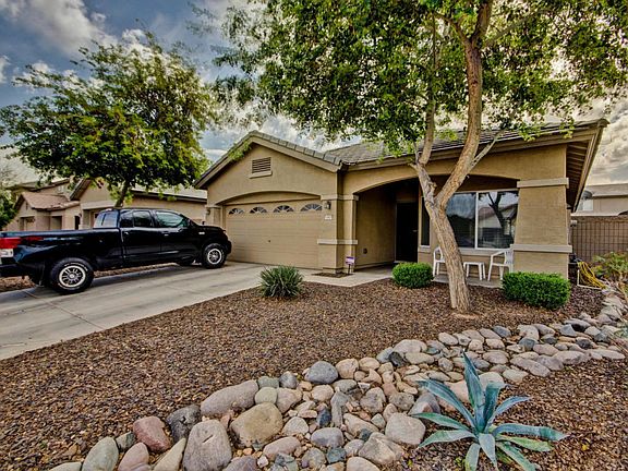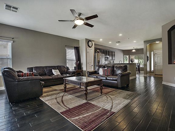 BEAUTIFUL 3 BEDROOM HOME WITH UPGRADED WOOD AND TILE FLOORING IN GOLF COURSE COMMUNITY! This spacious home boasts a large Great Room, 9' ceilings, upgraded cabinets with crown molding, stainless steel appliances, gas range, NEW dishwasher, large breakfast bar, gas hookup option at dryer, upgraded ceiling fans, two-tone paint, engineered wood flooring, split Master floor plan, updated bath fixtures and mirrors, double sinks at Master Bath, glass block at Master Tub, bay window at Master Bedroom, Venetian blinds, garage storage racks, upgraded baseboards, security screen door, covered patio, back yard lawn with border, and more! Great location near elementary school, community park, and golf course! Just minutes from shopping, restaurants, and the I-10 freeway. Must see!