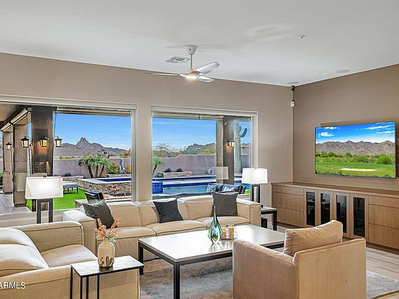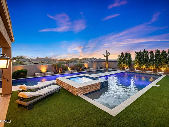 Step into a backyard sanctuary where every detail has been thoughtfully designed. The complete demolition and replacement of the backyard reveal a stunning landscape featuring a lap pool meticulous crafted for serious swimmers, measuring an impressive 53 feet in length and 9 feet in width with underwater wi-fi speakers. Adjacent, discover the main pool and spa complemented by a Baja shelf, and elegant water features including a soothing waterfall. Control it all effortlessly with iAqualink technology. Tall Ficus trees provide serene privacy as you entertain guests at the BBQ, gather around the firepit, bask under the sunshades on the lush turf and porcelain-tiled patio deck, or turn on the built-in heaters for added warmth in the Wintertime. "Carl the Cactus," a majestic Saguaro, adds character to your outdoor haven.