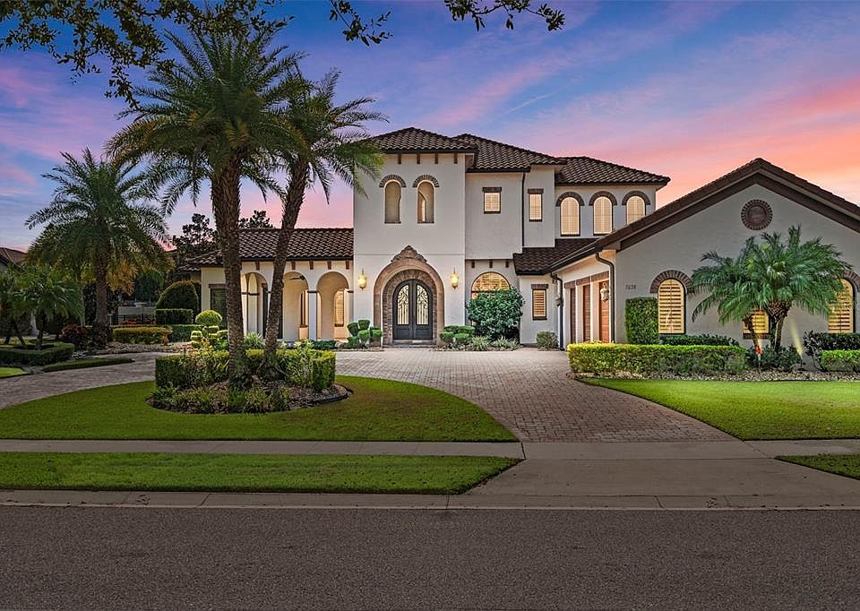 Step into a world of opulence within this former model home by the acclaimed custom builder, Brierhill Homes. Nestled in the coveted guard-gated Waterstone community in Windermere, this property offers the epitome of luxury living. Comprising 5 bedrooms, 5.5 bathrooms, and a circular driveway leading to an expansive 3-car garage, this residence exudes elegance from the moment you pass through the grand 9’ Cantera design arched steel front door. The heart of the home beckons, featuring a formal living room adorned with a fireplace and an expansive dining room capable of accommodating your entire family. These central spaces are enriched with custom columns and exquisite trim work, radiating a sense of style and sophistication. The chef's kitchen, a true culinary masterpiece, showcases a custom range hood with precast stone and travertine accents above a 36” Professional Series stainless steel natural gas cooktop. Granite countertops with a travertine backsplash complement custom maple cabinets, all accentuated by Thermador appliances. An oversized granite-topped kitchen table comfortably seats up to 8. Adjacent to the kitchen, discover a wine cellar behind a decorative wrought iron door, and a convenient wet bar area with refrigeration. The primary suite embodies tranquility, boasting a spacious custom closet and a well-appointed bath with a garden tub, shower, dual sinks, and a vanity area. An adjoining office provides a separate outside entrance, complete with a charming courtyard and front porch. The first floor also offers a second bedroom ensuite with generous closet space, a mud area, and an oversized laundry room replete with ample cabinets and room for a full-size refrigerator. Ascending the spiral staircase with travertine treads, you'll find a loft/sitting area and three additional ensuite bedrooms, all with spacious closets. The expansive fenced backyard is a private sanctuary, enhanced by mature landscaping. Here, you can revel in the outdoor kitchen, relax in the pool bath, and bask in the warmth of the fireplace on the screened lanai with wood-paneled ceilings and a travertine deck. The screened saltwater pool/spa, complete with a swim shelf and soothing fountain, can be heated for year-round enjoyment. This home is replete with remarkable features, including disappearing edge glass sliders in the family room that seamlessly connect to the pool deck. Other notable details include hand-stained ceiling beams in the kitchen, wide plank walnut wood and travertine floors throughout, Restoration Hardware lighting, tankless gas water heaters, built-ins in every corner, a whole-house audio system inside and out, plantation shutters, and the peace of mind that comes with a whole-home Generac backup generator. Positioned just around the corner from Windermere Preparatory School with private community access, and in close proximity to Windermere High School, Disney, shopping, dining, and the many attractions of Central Florida, this property defines an exceptional lifestyle.
