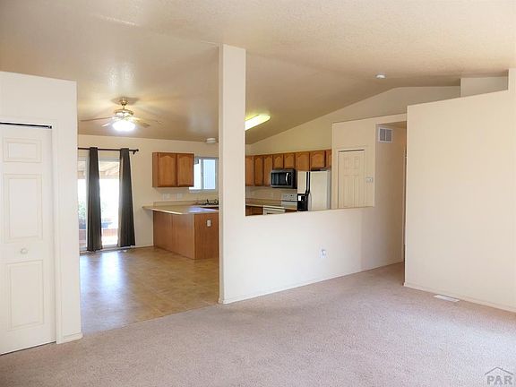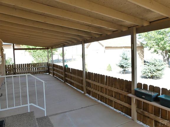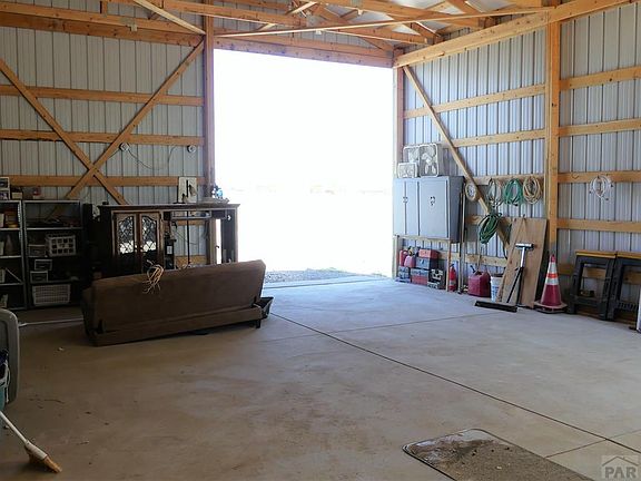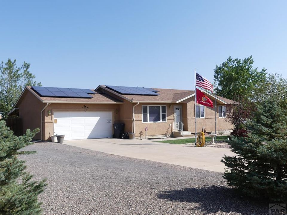 Wonderful opportunity in Pueblo West, not far from Purcell, so easy access to Pueblo or Colorado Springs. Attractive front yard with rocks and trees...low maintenance by design. Rancher with 3 bedrooms gathered together on the main floor. Basement has the vinyl floor laundry area, a rough-in for future plumbing, and the entire rest of the basement has carpet put down. Walls are insulated but unfinished. Huge covered back patio is enclosed by a fence and perfect for enjoying the pleasant temps. A large shed is on a concrete floor, and the RV building is in excellent shape. You have a drive through door on one side, so that you can drive in the front and pull out the back....no more backing trailers or boats into buildings. The other side has a door on one side. Back yard has rock and trees, front also has some artificial grass. Concrete drive to the street.... Garage is already set up as a nice workshop. Vaulted ceiling between open kitchen and living room. Lots of ceiling fans, plenty of storage, pantry and the like. Solar panels are owned and provide a tremendous amount of the electric needed for the home. RV building is 36 feet long by 24 feet wide, and the drive through doors are 11 feet wide by 12 feet high. The stucco shed on a concrete floor is 12 feet by 20 feet long.