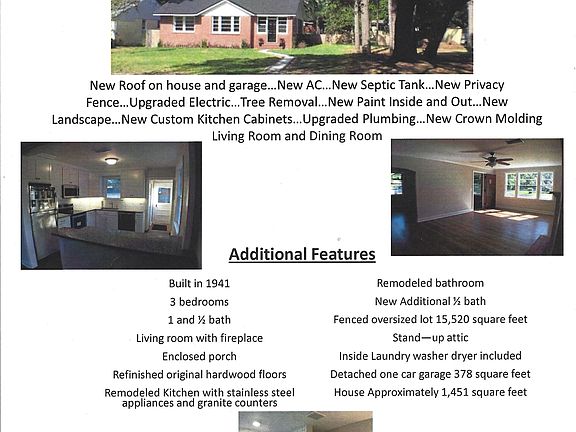 Charming completely renovated and updated brick bungalow in Hendricks School district. Walking distance to local restaurants, churches and school. Fenced lot 13,192 sf (a lot & half) and stand-up unfinished attic. Updates include: new roof on house & garage, new a/c, new septic tank, new privacy fence, upgraded electric, new custom kitchen with new appliances, custom cabinets and hard surface countertops, upgraded plumbing, new crown molding in living room & dining room, enclosed porch, refinished original hardwood floors.