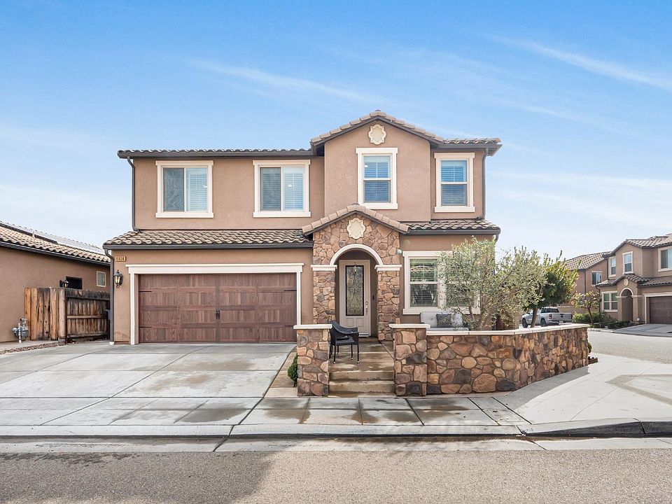 Located in the highly desirable Via Fiore neighborhood at Copper River Ranch, this stunning home offers 2,347sqft of luxurious living space on a spacious corner lot with extended driveway and front courtyard. Featuring 4 bedrooms, 3 bathrooms, this home includes an isolated guest bedroom and full bathroom on the main level, ideal for multi-generational living or hosting. Step into a grand foyer with elegant wainscoting that leads to an open floor plan great room, perfect for entertaining. The kitchen is complete with an oversized island and breakfast bar, walk-in pantry, and stainless-steel appliances and upgraded backsplash and diamond tile layout. Sunlight floods the space through sliding doors that open to a covered patio, enhancing the indoor-outdoor connection. Upstairs, the versatile loft offers endless possibilities as a second living area or home office. Three bedrooms are located on this level, including the relaxing primary suite. The spa-like primary bathroom features a soaking tub, separate shower, and a large walk-in closet. This energy-efficient home includes solar power and a universal electric car charger for EV. Backyard includes upgraded solid color concrete with stamp, gutter lighting and design. Finished garage with cabinet storage. Located near local restaurants and shopping, and within the award-winning Clovis Unified School District, this home is the perfect combination of convenience and elegance.