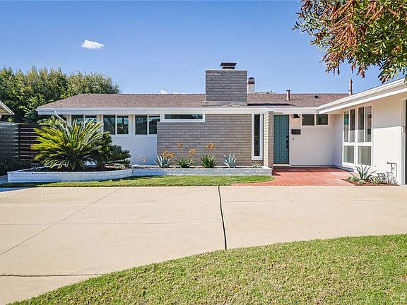 Impeccably updated throughout, this 1959-built Mid- century modern home will take your breath away at first impression! Spanning 1,736sf, its remodeled and freshly painted single-level structure sits on a 7,395sf lot with new manicured landscaping and pretty curb appeal. Wood and brick elements greet you upon entering the foyer and fireplace-warmed living room as vaulted ceilings adorned by recessed lighting soar above. Recently installed wood- style laminate flooring continues throughout, from the sunlit dining area to the reimagined kitchen. Custom cabinetry, a decorative backsplash, Calacatta quartz countertops, and full stainless steel appliance package are among the brand-new features equipping the avid cook.
