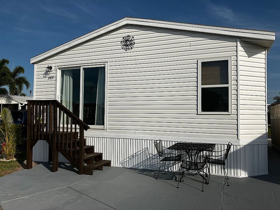 2 bed 2 bath manufactured home in highly desirable all-ages "Holiday Condo" gated community. Ten minutes to Fort Myers Beach. Sanibel and Captiva are also within easy driving distance. Holiday Condo is one of the few parks where you don't rent--you own the lot! Low HOA fee includes water, trash removal, lawn care, and use of all facilities--2 pools, 2 tennis courts, shuffle board, lawn bowling, horseshoes, laundry, children's playground and meeting rooms. This well-run, active and friendly community holds frequent events during the season. The house was purchased as a foreclosure just before Hurricane Ian, which it withstood successfully. It is elevated and so wasn't flooded. In 2023, the home underwent a complete renovation including new roof, vinyl siding, windows, doors, flooring, A/C and appliances. This move-in-ready home includes all appliances, furniture, TV sets and decor. Whether you will be a snowbird or full time resident, you won't find a better value anywhere in the State of Florida. Agents: if you find a buyer we will pay 3% commission,.