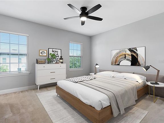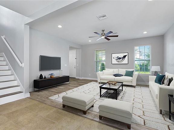 DISNEY FIREWORKS VIEWS!! This beautiful two-story 1,957 square foot Windsor floor plan is nestled within the heart of Ashlin Park. Open and spacious first floor with wide open views from the front door to the beautiful kitchen. A huge family and dining area, an elegant kitchen accented with rich granite countertops throughout. Along with stainless steel appliances and direct access to the attached garage. Upstairs has a beautiful master suite with a large walk-in closet, and a bright master bathroom with double vanity sinks, private water closet, and huge walk-in shower with upgraded shower head and luxurious rainfall shower head. The entire home is upgraded with great technology including Ring Doorbell, Google Nest Thermostats downstairs and upstairs, and wifi enabled switch for under and over cabinet lighting. The entire interior of the home has been professionally painted using Sherwin Williams Passive Grey paint throughout, and all doors and trim were painted with Bright White paint as well. The home features an attached garage with an extended driveway, allowing for 2 cars in the garage, and additional vehicles in the driveway. Rear bedroom has breath-taking views of Magic Kingdom fireworks. Ashlin Park community features charming streetscapes with sidewalks, pocket parks, and green space throughout the community. It also has a resort style pool with a community clubhouse. This home is located within steps of the pool, and just 4 houses down from a charming children's playground. This location boasts top-performing schools and is in a convenient location to many of the world's most sought-out attractions & restaurants. Ashlin Park is located off State Road 535, which provides convenient access to I-4, 429, & neighborhood shopping. Upgrades to house include Ring Doorbell (front door) Google Nest Thermostats downstairs and upstairs White cabinets in kitchen Granite countertops Fresh coat of Passive Grey Sherwin Williams Satin paint throughout house Fresh coat of Bright White Sherwin Williams Paint on all doors and trim Under and Over Cabinet Lighting in kitchen with Wifi enabled switch DirectTV Satellite already installed and ready for use if needed Professionally manicured yard Long driveway that can fit up to 4 additional cars plus the 2 in garage Attached 2-car garage Grey laminate wood floors in living room Laminate floors on stairs with bright white risers Community Features Charming streetscape with sidewalks, pocket parks and green space meandering through the community Private HOA Conveniently located near shopping and dining options Located near World Famous Orlando Attractions Resort Style Community Pool with Community Clubhouse Community outdoor green spaces throughout the community including, landscape mews, and a children's playground.