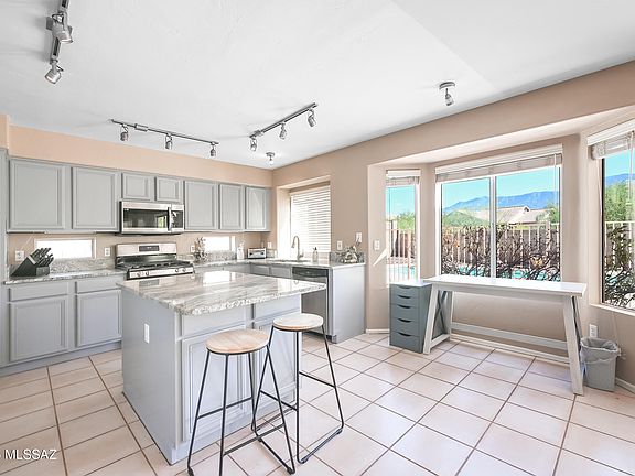 Discover your dream home in this stunning 5-bed, 3-bath home that combines charm, comfort, and functionality. You'll be captivated by the attractive curb appeal, low-maint landscaping, and a roomy 2-car garage. Open airy layout with soaring ceilings and tons of natural light. New wood-like flooring in living areas, formal dining area and cozy living room with fireplace for gathering or relaxing. Great kitchen with granite counter-tops, abundant cabinetry, walk-in pantry, stainless steel appliances, and a center island with breakfast bar. Enjoy casual meals in the charming breakfast nook and enjoy the Catalina Views from the kitchen and living areas. Upstairs primary suite offers an outdoor patio and mountain views. Come take a dip in your sparkling pool and entertain your friends.