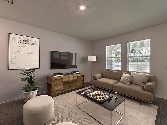 This home's generously sized covered patio, with dual sliding glass doors, allows plenty of natural light to shine in. Modern white cabinets, grey quarts countertops, wood like tile flooring and neutral gray carpet in our Inspire Package.