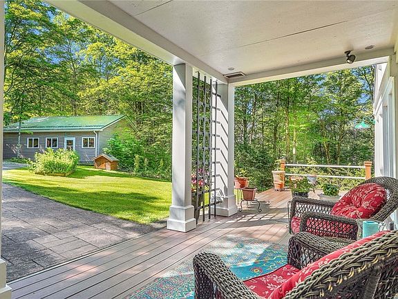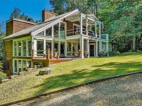Welcome to this Contemporary Craftsman 2533 sqft home on a 1.7 acres, pie-shaped, wooded lot. Country living at its finest & walking distance to 600 acres of State land. This home incl.2 beds, 2 baths w/an open flrpln & uniquely designed architecure that beautifully defines each space & allows the light from the 2-story windows to flood each area of the home, providing incredible views of the surrounding woods. The main level also includes a full bath, a sizeable bedroom, a sunken living room w/a cast iron fireplace insert, a remodeled kitchen (2020) with quartz countertops/handmade pottery tile backsplash/Blanco sink/antique cast iron wood-burning stove/newer appliances. Upstairs you will find a large master bedroom that overlooks the front covered terrace, a master bath w/a clawfoot soaking tub, & a catwalk that leads to a 2nd floor office which could be a 3rd bedroom. The ext. construction is red cedar. The upper terrace, back deck, walk-out basement, & brand new fire pit allow you to enjoy the property in so many different ways. A detached 2-car garage w/added room & a storage shed add storage options. No showing till Wed7/10 OH 5-7pm, Sat7/13 OH 10-12, Sun7/14, OH 1-3pm.