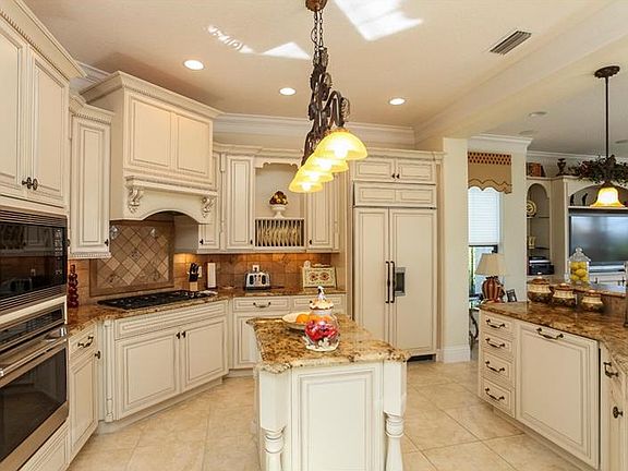 Keene's Pointe. Pristine Lake front Property. The owner of this home has spared no expense with upgrading this fabulous home. It features 5 bedrooms, 6 bathrooms, a large bonus room with a full bath, an amazing outdoor summer kitchen to add to the custom pool with spa. Entering through the over-sized double entry doors you will find a spacious great room. The master suite is crafted with large windows and has a private French door access to the rear lanai and pool. The suite features his and hers walk-in California closets, the nicest spa shower with multiple shower heads and body sprayers. His and hers vanities with granite tops and soaking tub. The kitchen is amazing with 42" cream cabinets, under cabinet lighting, granite work-spaces, and walk-in pantry. The appliances are stainless steel which includes 36" gas cook top, oven, built-in microwave, built in refrigerator, dishwasher and next to the kitchen a wine cellar. Sitting adjacent to the relaxing great room. On the 2nd floor are 4 bedrooms.