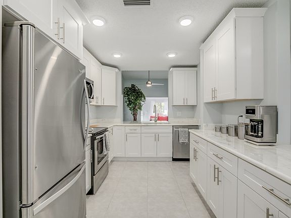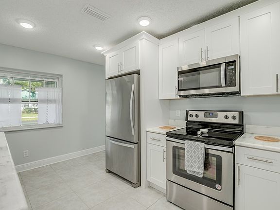Completely updated with new, easy to maintain tile floors throughout. Vaulted ceilings in the living area and master bedroom. Real wood cabinets in the kitchen and baths with soft close doors and marble countertops. Kitchen boasts stainless-steel appliances, a pass through with an extended countertop for casual dining, and efficient LED recessed lighting. New fixtures in both baths with new tile surrounds, including the walk-in shower in the master suite. New ceiling fans throughout. The front screened porch and rear paved patio offer space to relax outdoors and there are no rear neighbors. Plenty of storage including a walk-in closet in the master bedroom. The garage has ample space for gear and washer/dryer hook-ups. HOA fee covers lawn maintenance, trash service, irrigation system and basic cable. Amenities include two pools, tennis court, and a clubhouse with a variety of social events. Golf is available with additional fees. This is a 55+ gated neighborhood with lots of green space that beckons walkers and cyclists. A wide variety of shopping and dining opportunities are nearby, and the public beach is just a few miles away. Easy access from the 589 parkway and US 19.