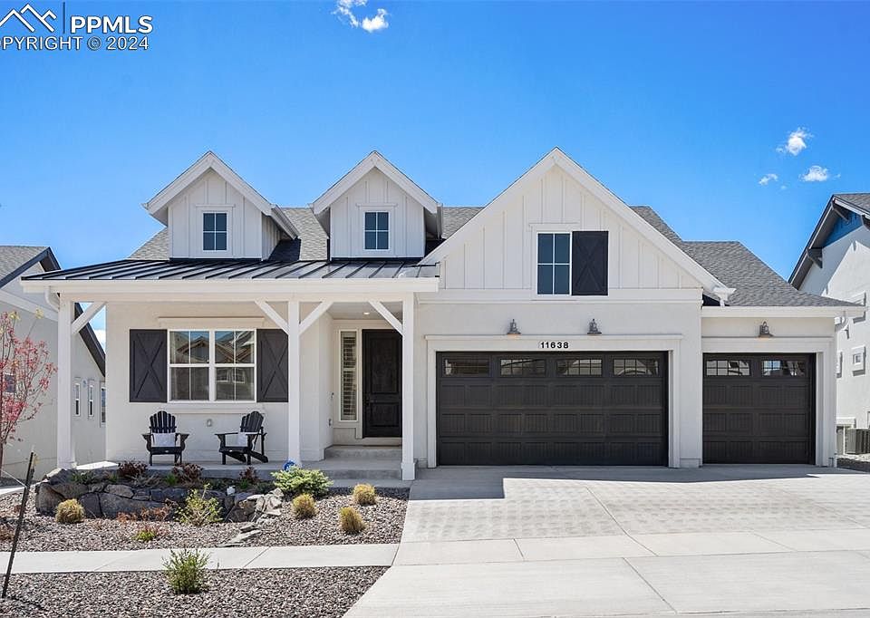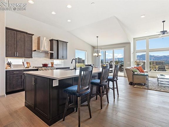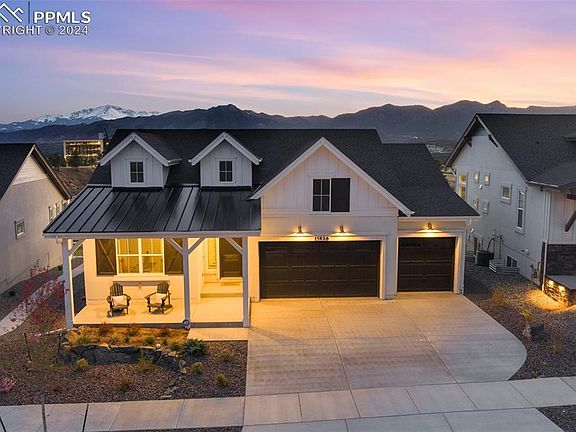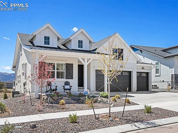 Welcome to this immaculate ranch-style residence showcasing unparalleled vistas of the Colorado Springs front range and the iconic US Air Force Academy. Step through the covered porch into a seamlessly designed floor plan beckoning relaxation and comfort. The Great Room adorned with a built-in entertainment center and gas fireplace invites you to unwind in style. Culinary enthusiasts will revel in the gourmet Kitchen boasting KitchenAid appliances, a sizable island for casual dining and abundant natural light bathing the adjacent dining area. Retreat to the expansive composite deck offering the ideal spot for savoring morning coffee, evening cocktails and even watching the Air Force Thunderbirds at graduation. Indulge in the luxurious Primary Suite featuring a sitting area, a spa-like bathroom with lighted mirrors (note them in all of the bathrooms), and spacious walk-in closet. The main level also hosts a versatile second bedroom or study, full bathroom, and well-appointed laundry room for added convenience. Descend into the finished basement boasting 9’ ceilings and an array of entertainment options including a generous family room, bar area and game space. Two generously sized bedrooms and a full bathroom ensure ample accommodations for family or guests. Step outside to the walk-out basement patio complete with a soothing hot tub, fire pit area and meticulously landscaped surroundings. Efficiency and innovation come together with modern amenities like a tankless water heater and 96% energy-efficient furnace. Nestled within the coveted Farm community this home offers access to amenities such as a community center with pool and fitness facilities, a serene lake for fishing and water activities like paddleboarding and kayaking, and expansive walking and biking paths. Conveniently located near the USAFA as well as the vibrant dining, shopping and new concert venue of Northgate, with easy access to I-25, this residence promises a lifestyle of luxury and functionality.