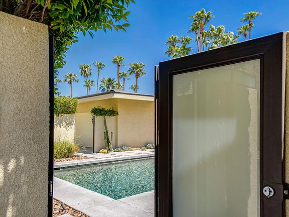 Inspired modernist architecture showcases views at every turn! This architect's vision for maximizing the hillside was achieved in a big way for this former darling of Palm Springs Modernism Week. Living areas flow effortlessly, one to the other. The sunken living room is surrounded by clerestory windows and walls of glass. Formal entry is framed by entertaining areas, a wet bar on one side and a wine bar on the other. Steps away, formal dining and a magnificent chef's kitchen. The designer doubled up on ovens, dishwashers, and sinks plus a built-in espresso machine. Lovely breakfast area is a destination in it's own right. Like everywhere else, doors swing open and the outdoors meet the indoors. Large central corridor leads to a den and 'mid-mod meets post modernism' inspired powder room. Oversized master bedroom's views translate to waking up in bed, hitting the shades, and BAM!, the view. En-suite bathroom speaks to the good life with its tub and steam shower design. Walk-in closet with island and dressing area complete this space. The Shower has its own access to the outdoors. Guest bedrooms are also En-suite and feature private patios meeting-up to the pathway headed to the pool terrace. Life is good where Vista Las Palmas meets the San Jacinto's. Private gates are yet another plus and yet you are surrounded by one of the West's most beloved neighborhoods. Enjoy it all.
