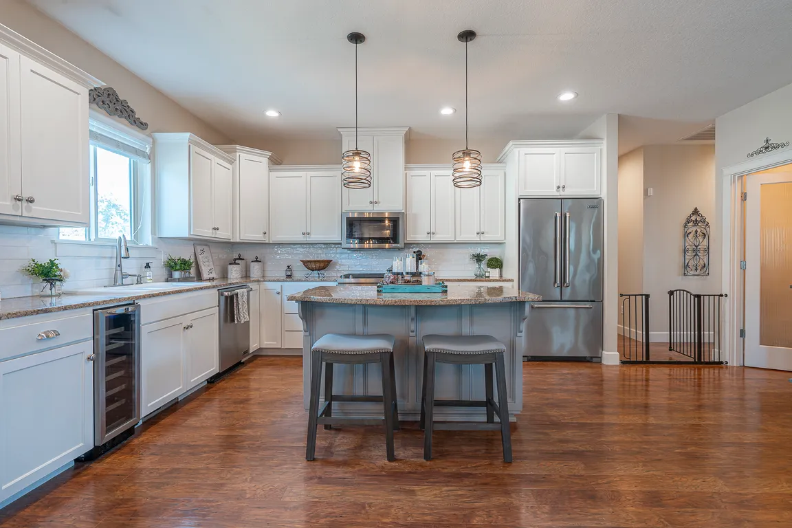 Walk in closetChic primary suiteCenter islandFull pantrySs appliancesWine fridge