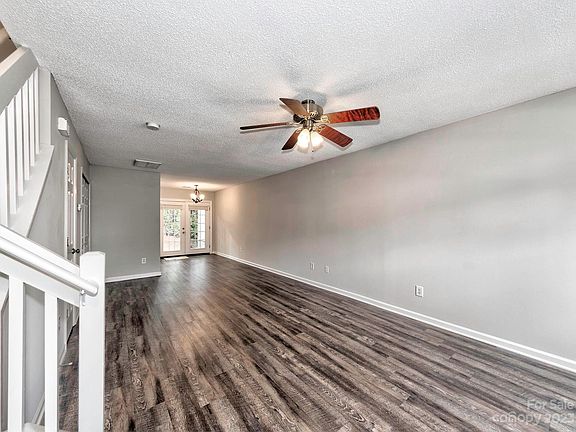 Kitchen is in the back which gets some nice natural light from the backyard. Luxury vinyl plank throughout the first floor. Upstairs one will find 2 spacious bedrooms and a full bath. Vaulted ceilings add to the home. Nice treed backyard. Updates to the home include HVAC replace in 2020. Luxury Vinyl plank replaced in 2020. New hot water heater - 2021. New interior and exterior light fixtures - 2021. New back French door and blinds - 2023. Freshly painted and new carpet - 2023. Window blinds - 2023. Washer, dryer, fridge is included!! Also, water and sewer are included in the monthly HOA fee! Don't forget to take a look at the community pool which is included with the HOA. Home is close to highways, shopping, restaurants, and so much more. This home was greatly taken care of.