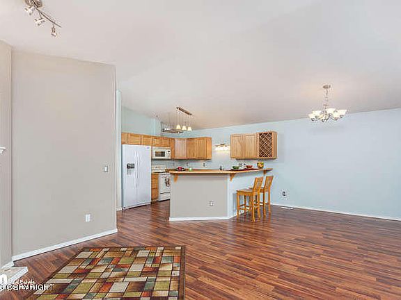 Easy south Anchorage living in this well maintained & updated property with fresh interior designer paint colors, vaulted ceilings, mountain views, gas fp, built-in office nook, breakfast bar & laminate flooring. A wooded back yard for privacy. Bring your buyers, they will not be disappointed. The 3rd BR can be used as a family room, has two closets and a sliding door to small deck