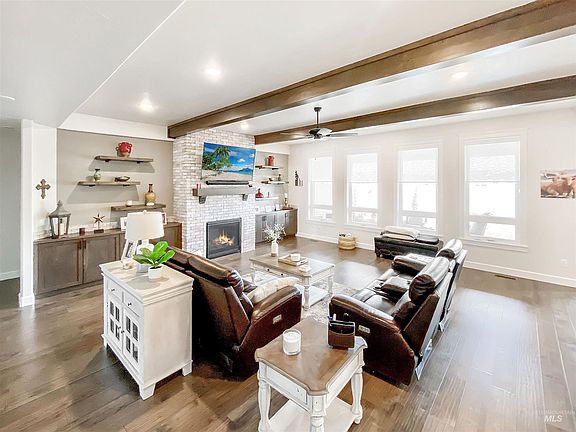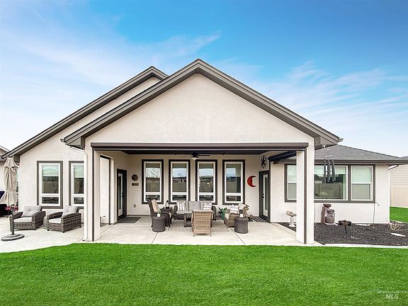 Custom stunning home tucked in a cul-de-sac in Star! This welcoming 4 br/3 ba home with 10' ceilings features granite counters in a large kitchen with custom cabinets overlooking the great room with a stone floor to ceiling fireplace, custom shelving. Lighted display shelving in entry. LED lighting throughout with slide dimmer switches on most lights, water softener, custom patio screens with remotes, extra-large covered patio for entertaining overlooking the upgraded landscaping, custom blinds throughout, beverage cooler. The spacious main room has a tray ceiling, main bath has tile floors, shower and tile surround on tub with a ceiling heater and fan added for extra comfort plus more. The bonus room upstairs is next to a full bathroom and bedroom. Open house Sunday March 6, 2022 from 11am to 2pm.