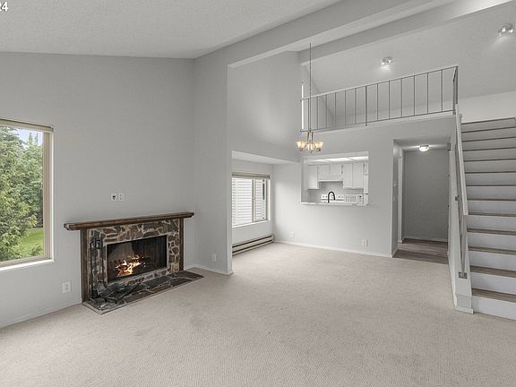 Bright and spacious contemporary condo in Beaverton! Top level unit with private balcony deck overlooking lush surroundings. Vaulted ceilings in living room, dining room and upstairs loft. Loft can be converted to a third bedroom. Cozy up to your wood burning fireplace. Primary bedroom with ensuite bathroom and double closets. Unit includes laundry room, storage unit on deck, carport, and easy guest parking. Amenities include: pool, tennis court, meeting/ rec-room with full kitchen and RV/ boat storage. Great location between Washington Square and Progress Ridge with easy access to 217 and 99. All appliances included! No rental cap!