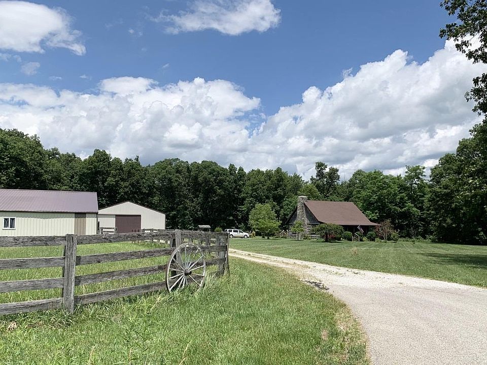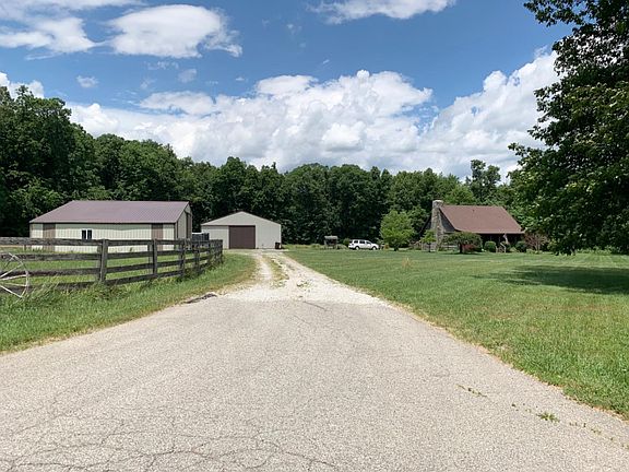Home Sweet Cabin! End of dead end road, extremely private. Land is park like, mostly wooded and level. 2 large barns 40x70 with partial concrete, water, electric, stalls, workshop and cool man hangout. 36x44 barn/garage has concrete, electric and water. Cabin is cozy with beautiful field stone floor to ceiling fireplace and hardwood floors. Kitchen has neat replicated vintage stove with stainless fridge and dishwasher. One of a kind, hard to find in this location!! 15 minutes to I-74 and classic old grocery store. 20 minutes to Batesville super Kroger. *Possibility of 1 acre with pond available.