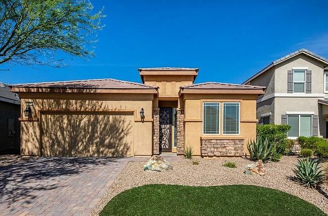 This beautiful single story 3 Bedroom Home is ready for you! Filled with tremendous amenities. Stainless steel appliances throughout the kitchen. Large island with granite counters. Open, floorplan with 3 bedrooms plus office/den. Upgraded flooring, 2 inch blinds throughout, valances, surround sound speakers throughout house, ceiling fans, fire sprinklers, built in garage cabinetry with granite. Covered patio in private yard with no neighbors behind. Low maintenance inviting landscaping. Security doors in front and rear of home. 2nd and 3 bedrooms share a jack and Jill bathroom. The perfect floorplan for everyone! Enjoy nearby Wetlands Park for hiking and strolling within a 5 minute walk from this home.