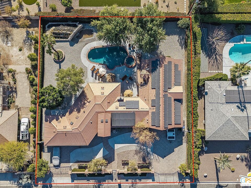 Welcome to your desert estate in the heart of Palm Springs. Built in 2009, this meticulously crafted property offers a harmonious blend of smart design and style. Set on an expansive 4/10 acre lot with 2,443 square feet of living space, including a spacious attached casita. This home boasts 3 spacious bedrooms, an office/den and 4 elegantly appointed bathrooms, ensuring comfort and privacy for all. Step inside to discover a bright and spacious interior, featuring a chef's kitchen equipped with top-of-the-line Viking appliances, a 48" range and wok station, hood, warming drawers, ice maker, 3 dishwashers, and wine and beverage fridges. The expansive azul granite countertops and smart layout make this kitchen a culinary dream. The open-concept living area is perfect for entertaining, highlighted by a motorized 120-inch screen and HD projection tv for the ultimate home theater experience. Outdoor living is elevated with an observation deck, a sparkling pool and spa, waterfall pond, outdoor shower and tv, all set against the backdrop of stunning mountain views. The rooftop terrace offers a serene escape, perfect for enjoying the breathtaking scenery. A two-car garage, plus an additional 1500sf temperature controlled double bay garage provides ample parking and storage. The bonus garage can accommodate an RV, boat, car collection (up to 5 cars), or can be transformed into a home gym, office, or studio. The quality of construction is evident throughout, with a durable metal roof, herringbone brick wall, cobblestone paver driveways, and solar panels with 2 batteries enhancing the home's efficiency. The property is gated, offering privacy and security, while the double gated circular driveway accesses both garages. Additional amenities include a full laundry room, pantry, media closet, and multiple skylights. Conveniently located a short distance to downtown shops/restaurants and Ruth Hardy Park. Make this exceptional property your own. *Some images digitally rendered to show paint and design options.