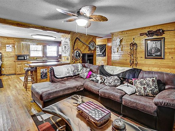 Seclusion on 4.8 private acres but minutes from shopping! Open floor plan in this cute ranch home w/hardwood floors, white pine & cedar walls. GR w/fireplace opens to kitchen w/eat-at bar, pantry, island, stainless refrigerator, microwave & range remain. Laundry room w/storage cabinets & LVP floor. Double detached wired garage w/new copper penny roof & concrete floor. 5 stall equipment shed & dog lot. New exterior stain, welcoming front porch, nice back deck & gated drive. Beautiful private setting!