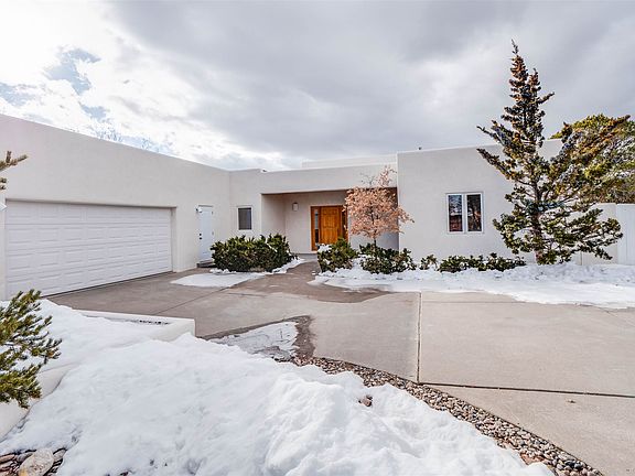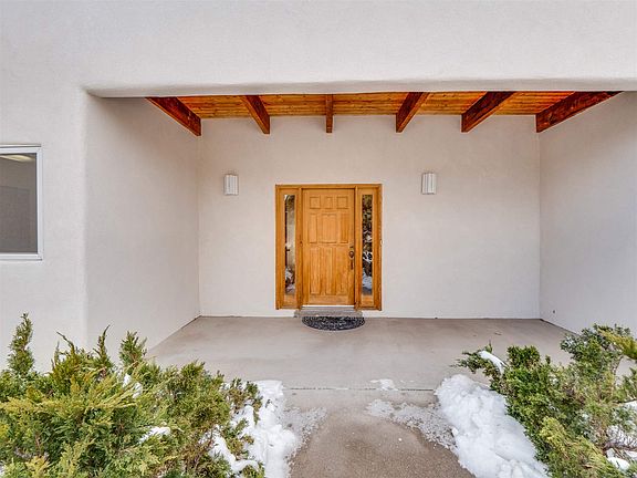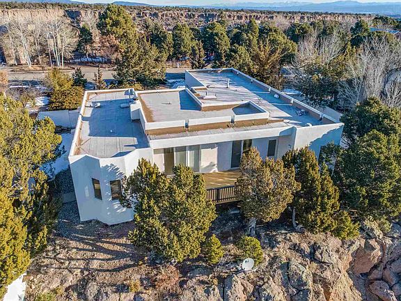 Great Southwest style home on a desirable Los Pueblos lot. This home is perched on the canyon's edge providing expansive panoramic views of Bayo Canyon, the Sangres and Jemez Mountains. Fresh stucco in November 2019 (w/ transferable warranty) and neat wood beamed covered porch welcome you as you enter via the curved driveway. Inside provides comfortable single level living with a very nice floor plan. The large entryway leads to an open living space with high ceilings, wood-burning fireplace, and large slider door to the recently updated deck where you'll likely spend much of your time taking in the views enjoying the tranquility of it all! Working from home would be a treat in the office space with a view located just off the living area. The large kitchen has a custom Sub-Zero refrigerator, ample cabinetry and counter space with bar area connecting nicely to a dining space and another slider door to the deck. The master suite located privately on one side of the home has a sitting/office area with a view, en suite with double sink vanity and relaxing jetted tub accented by a window. The large walk-in closet has two separate sides each with custom built-ins. Two guest rooms and full bath are well located on the other side of the home. Tile flooring with radiant heat zones and baseboard heat in the carpeted rooms keeps things cozy. A fenced side yard with grass is great for pets while a drip system makes for easy landscape maintenance. This home is ready and waiting!