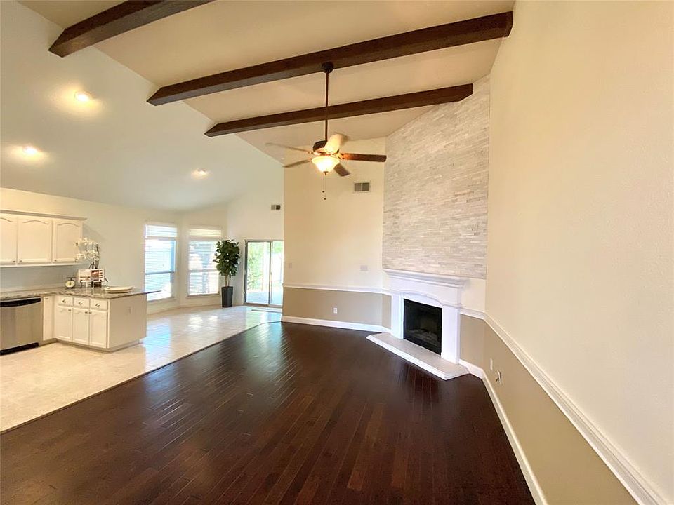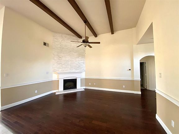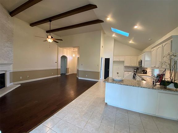 Character filled single story home with high ceilings, wood floors throughout, exposed beams & quartz stone wall treatment above cast stone electric fireplace! Kitchen open to living with vaulted ceiling, granite counters, single basin granite sink, stainless appliances & large peninsula with barstool seating. Bedrooms feature custom paint & chair rail. Located on corner lot, home is surrounded by trees with landscaped front & backyard & 14'x14' covered patio. Quiet idrive MyQ garage door opener. Nest thermostat. Soffit lighting. New fence. 2016 roof & water heater. Adjacent greenbelt features playground, walking paths & pond. 3 community pools, 1 within walking distance. Single owner, well kept.