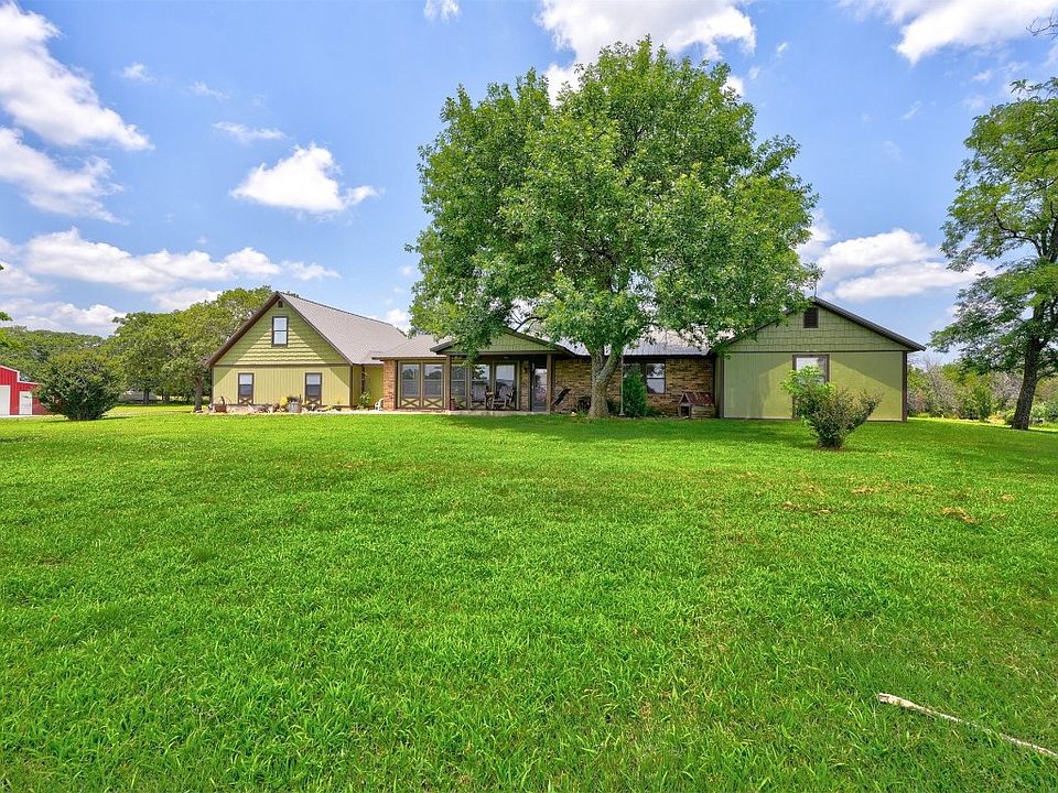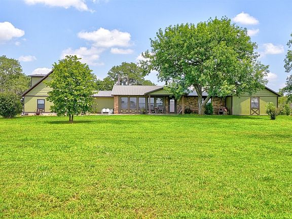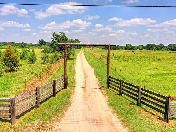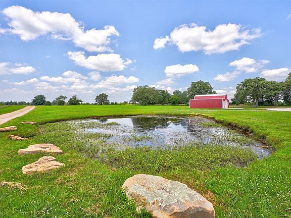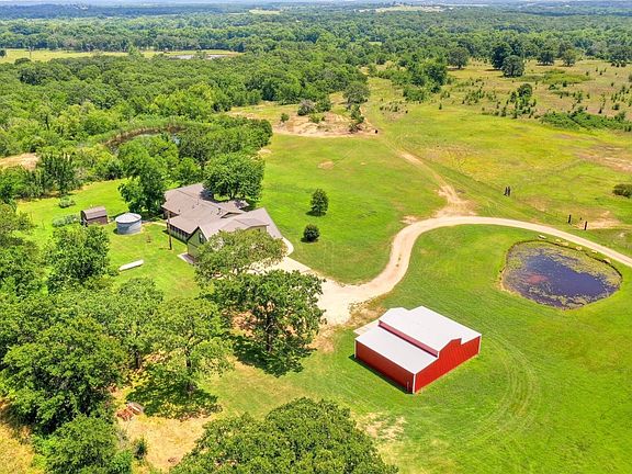 Spacious home sits on 77.35 acres that is totally fenced, mostly cleared, and has 4 ponds. The home features a remodeled kitchen with acid stained concrete countertops sealed with epoxy coating, brick backsplash, and a large walk-in pantry with space for a freezer. The open living room has a wood burning fireplace and many windows over looking the front pond and pasture. There are 4 bedrooms downstairs with an extra study area. The primary bedroom bath has a cast iron cowboy skirt tub that is perfect for relaxing and also has a spacious tiled shower. The walk-in closet has a built-in dresser. Upstairs above the garage is the 5th bedroom that has a living area and a full bath. It has a 3 zoned mini split that keeps it nice and cool. Luxury vinyl is throughout the main part of the home with some tile and carpet in the bedrooms and baths. The back patio is screened in and the garage has a storm shelter in the floor. Outside you will find a 20x30 barn with concrete floors, electric brought up to it and also plumbed for a toilet and sink. The center bay is 12 ft tall with re-enforced flooring ready for a lift. There is another 20x30 barn closer to the front south pond that has a tack room, half has stalls and a loft. Out back is a chicken coup and the well house with extra storage. Don't miss out on this beautiful homestead. Call today for an appointment.