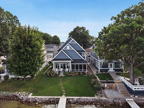 Location, location, location! Get ready to bask in glorious sunset views from idyllic craftsman style home on Lake Wawasee! Boasting gorgeous water views w/ sandy beach, fantastic screened plus open air porch, this custom TL Jackson built 4 bed, 3.5 bath is a stunner! Located on ultra desirable Ogden Island you'll be in excellent company in private, peaceful setting w/ minimal through traffic. Nestled on almost quarter acre & facing west, this 2013 built home offers amazing views, gorgeous inside & out & meticulously maintained. Exquisite presentation from moment you arrive, attractive & inviting exterior is picture perfect lake cottage w/ blue shingle, white trim & attached 3 car garage accented by professional landscaping & beautiful hydrangeas. Inside front door w/ twin sidelights & transom window you’ll find masterful mix of eclectic style both welcoming & refreshing w/ high quality craftsmanship & luxurious upgrades from classy hardwood floors to magnificent coffered ceiling in main living space—wired for surround sound on main level! Open concept floor plan provides immediate lake views from wall of windows in cozy living room w/ gas fireplace. Generous kitchen/dining prime for entertaining allows for meals w/ view in front of glass doors to enclosed porch beside built-in wet bar w/ wine fridge. Chef’s delight kitchen has everything you need w/ granite counters, abundant custom Yoders cabinetry, high end SS appliances & multi-level central island w/ bar height seating. Spacious main level primary bedroom includes spa-like en suite w/ granite counter vanity, tiled walk-in shower, separate commode & walk-in closet. Half bath, laundry w/ utility sink & cubbies by garage entry complete main level. Upstairs is incredible 2nd living/rec w/ pool table (included), full wet bar + fridge as well as 3 more comfortably sized bedrooms. 2 more full baths w/ granite counters & tub/showers are also up. Comes with central vacuum and Kinetico water system with filtered drinking water. Sure to be popular gathering point, screened porch w/ ceiling fan lets you relax lake side in comfort, or kick back on covered open air porch. Sizable yard w/ flat walk stepping stones to pier where you can keep all your water toys. Easily accessible 4’ concrete crawl = lots of storage w/ heating/AC, whole house generator & 2 furnaces. Don't let this one slip away!