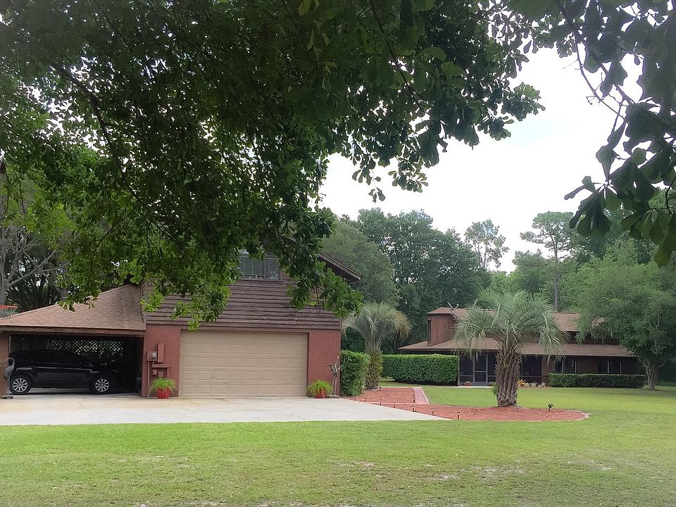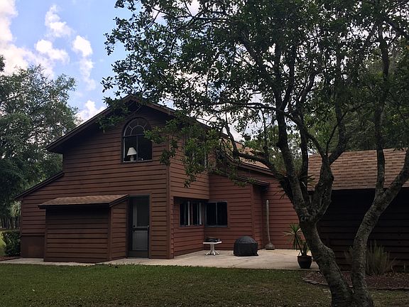 A hidden gem on 11 +/- acres abutting a private airstrip that includes all 3 parcel ID# 23-26-22-000000-031030, 23-26-22-000000-031020, and 23-26-22-000000-033100. Bring your horses and motor home! This meticulously kept property features a 2 bed 2 bath home with a separate 2 bedroom 1 bath garage apartment. A covered, screened patio lanai invites you into this beautiful home with an open floor plan. The kitchen looks in to the family room and boasts custom oak cabinets, Zodiac counter-tops, stainless steel appliances, and breakfast bar, and flows into the very large dining room with a refrigerated wine bar. Attention to detail shows everywhere in this home with custom moldings, beadboard, and beautiful views. The second floor master bedroom features gorgeous windows overlooking the rear of the property, a built-in entertainment center, and cedar lined closet. The second floor bath has a walk in shower and on demand hot water. The detached two car garage with half bath, also has covered parking for 4 more cars and a concrete parking pad. Above is a 2 bedroom 1 bath apartment with a large full kitchen, and a 10 x 10 elevated deck overlooking the property. There is even room for horses in the large barn with stalls and a loft. Lined with oak trees and crepe myrtles, you will enjoy the tranquility of this very private property.