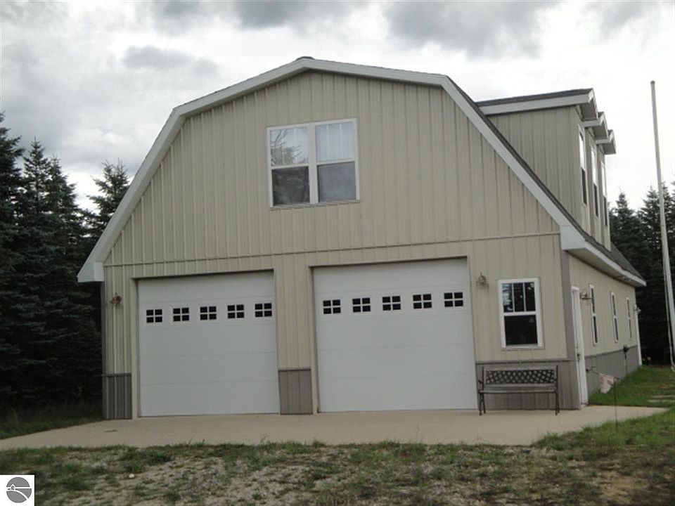 GREAT GETAWAY! Very unique! Pole barn with lodge-style appeal on five private acres - sharp upper level finished containing 4BR, full bath, kitchen/dining area! Sleeps several - plenty of room for everyone!! Main level is family room area, half-bath, utility, and huge space to bring in all your RV's - overhead doors on each end! Very neat setup!! Everything very modern, meticulously maintained and perfect for family get-togethers. Property perimeter is pines providing super privacy, yet open for great space for parking vehicles and RV trailers! Great location near Fife lake, within a mile or so of Springfield Park, and approx 2 miles to Manistee River at Rainbow Jim's Bridge! Kayaking, canoeing, snowmobiling, hunting very, very close!! Truly a unique set up!!