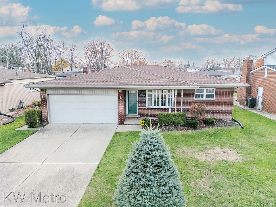 IMMEDIATE OCCUPANCY on this 3-bed, 1 1/2-bath all brick ranch home with almost 1,500 sq. ft. of living space. Attached two car garage plus an extremely large basement. This home provides nice curb appeal with a welcoming covered porch and front door entry. As you step inside, you will find a spacious living room with a large, picturesque bay window and entry closet. Living room leads to the amazing, open concept kitchen with an abundance of cabinets and counter space. The separate dining area and family room with gas fireplace and recessed lighting is the perfect setting for entertaining. Door wall off family room provides direct access to the cement patio and fenced yard. Three nice size bedrooms, all with large closets and full bathroom plus half bath complete the main level. Over 1,200 sq. ft. of basement offers endless possibilities for extra living space plus tons of storage and separate laundry room. Newer windows throughout. Affordable family home with easy access to many amenities.