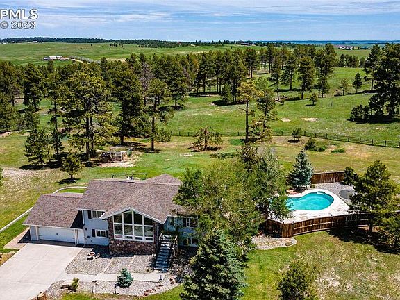 Welcome to your own amazing country retreat surrounded by towering ponderosa pines! Beautiful horse property located on 40 private acres, half mile paved and fence lined driveway, 8 stall horse barn with automatic waterers and heated tack room, 2 loafing sheds, 2 separate paddocks and pastures, 40x60 heated shop with painted cement floors and 2 post car lift, beautiful in-ground heated pool, in deck hot tub, 3 bedrooms, 3 full bathrooms, Pikes Peak views, bonus family room with fireplace, so much to offer. Located in Kiowa, ½ mile off paved roads. Kiowa school district. Horse lovers dream, car lovers dream, you could have it all! Must see to believe. New paint, new carpet.