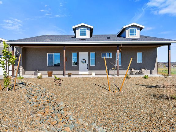 Stunning Custom Home in Prescott Prairie with Panoramic Views out Front and Back. Spacious Interior with Open Kitchen / Great Room Concept featuring Dormer Window detail at Entryway and Master Suite. Well appointed Interior Finishes and Colors - Awesome Kitchen with under counter Microwave and Beverage Fridge. Tile Flooring, Kohler Kitchen Sink & Plumbing Fixtures Throughout, In-Ceiling Speakers both Interior & Exterior, Master Sitting Room/Library, Modern Sliding Door @ Master, Freestanding Soaking Tub, Enormous Walk-In Shower with Dual Temperature Controls, Gas Fireplace, with Brick Surround, Propane Stub off Rear Patio, Storage Closet Off Garage. Front and Rear Landscaping with Drip System, Top Rail Fence with Dog Run and Vehicle Gate, HUGE EXTRA DEEP 3 CAR GARAGE! MUST SEE!!