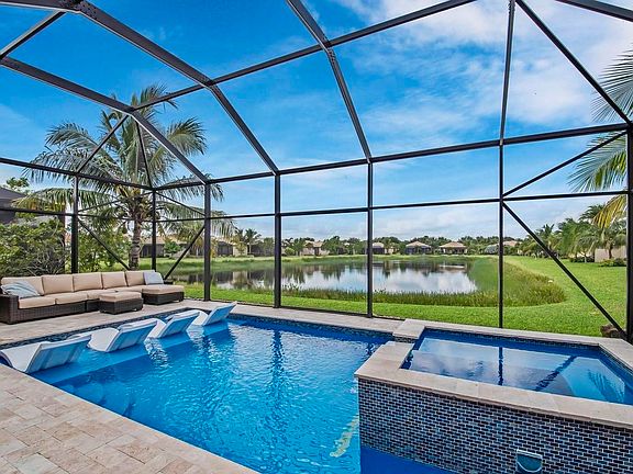 This stunning lakefront home is the tropical oasis you have always dreamed of. Ideal floorplan for entertaining with a formal living room, dining area, family room and screen enclosed patio. Delight your inner chef in the gourmet kitchen equipped with a center island, granite countertops, tiled backsplash, stainless steel appliances and family dining area. Retire to your master suite with a coffered ceiling and his & hers walk-in closets. Luxurious master bath boasts dual sinks with Quartz counters, framed mirrors, a soaking tub and a walk-in shower. Phenomenal outdoor living with a screen enclosed heated & cooled saltwater pool, spa, Travertine decking and a tranquil lake view. Neutral tile, smooth walls, surround sound and an abundance of natural light are just a few of many highlights.