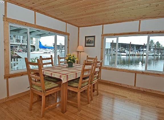Welcome Aboard! End Slip location w/40'x65'Float. This floating home has a Main-Cabin with 2 bedrms, 2 baths, and Great Room styling. The Aft-Cabin, a studio apt, has 1 bedrm & 1 bath, and can be rented. Room for 2 large boats up to 60' on one side with wrap around decks and covered decks too. Tool Shed with sliding doors off the deck. Pilot House(study)in front of Aft-Cabin. Lovely interior with bamboo floors and wrap around decks.