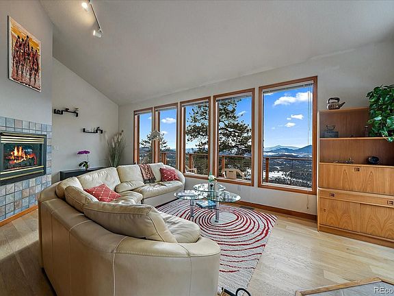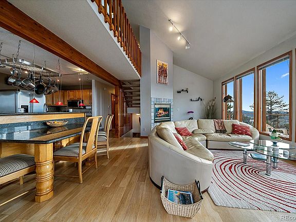 This fabulous home is located in Conifer in the Kings Valley Custom resort and sits at the top of the subdivision with panoramic views of Pikes Peak and the Western slope from the all areas of the interior of the home and the wrap around deck and a fire pit to relax around. It has 4 bedrooms and 3 bathrooms with an updated Kitchen that has a gas stove and grill that is vented and has a hood and has all stainless-steel appliances with granite counter tops and tile back splash and pull-out drawers and a pantry. The family room has vaulted ceilings with a gas fireplace and large windows with Awesome views and access to the wrap around deck to the southwestern exposure to view the beautiful sunsets, Surrounded with lots of Pine and Aspen trees. The driveway faces southwest so the snow melts quickly and this home is connected to the public water and sewer system.