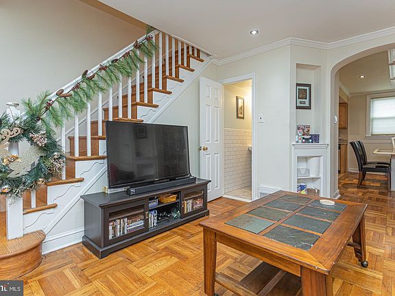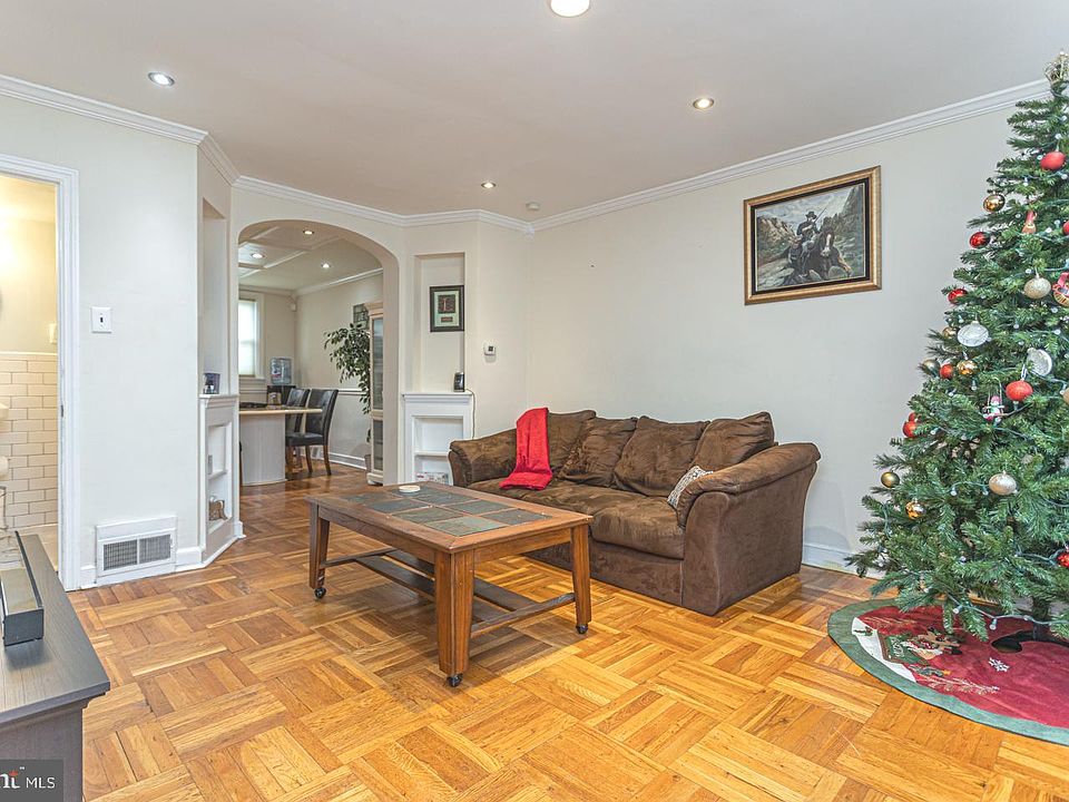 Immaculate brick-front rowhome on a quiet street in popular Mt Airy features new HVAC, 1-car garage plus driveway parking, fenced-in yard, & upgraded tilt-in windows! Beautiful curb appeal with the front portico and intricate wrought-iron pedestal & railing! Relax on your lovely front patio... perfect for entertaining! Step thru the upgraded storm and front door to your sundrenched living room, complete with glistening parquet floors, recessed lighting, and crown molding. The curved archway with built-in shelving & exquisite alcoves leads to the elegant dining room, with crown molding, chair rail, recessed lighting, & wainscoted panels on the ceiling! The stunning kitchen boasts granite countertops, oversized sink, gas range, Italian tile flooring & backsplash, maple cabinets with braided trim, & under cabinet lighting! The renovated main floor powder room has pretty subway tile, ceramic tile flooring, pedestal sink, new mirror & toilet, and brushed nickel fixtures. Conveniently located minutes from 309, 152, Old York Rd (611), & the train station. Plenty to do nearby at Morris Arboretum, Wissahickon Valley Park, Cedarbrook Plaza Shopping Center, Philadelphia Cricket Club, & the Curtis Arboretum . The full, walk-out basement can easily be finished, with ductwork and vents already installed, a media/game room, separate laundry room, and convenient interior door leading to the garage. The spacious master bedroom is highlighted by glistening hardwood floors, large closet, modern ceiling fan, wood trim, & designer custom paint. The additional bedrooms have rare parquet floors, neutral paint, and large closets. Even the expansive hall bathroom was remodeled, complete with ceramic tile flooring , floor-to-ceiling tiled Jacuzzi tub, double sinks with cherry cabinets, recessed lights, tv with mount, & 6-paneled door. Check out the hall linen closet! Don't miss out on this fabulous home! Schedule your appointment today!