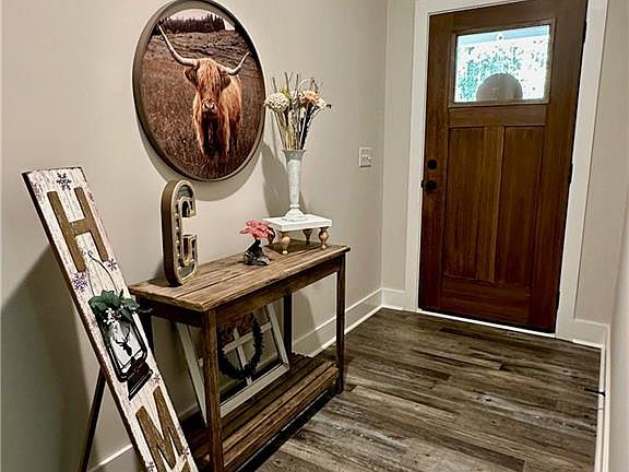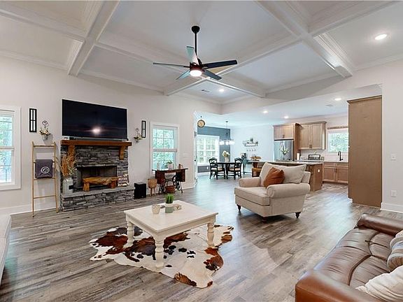2024 newly built by Denco Construction and gently used single level home on 2.74 acres. Entry foyer with LVP floors that run throughout. Gorgeous open floor plan with split bedrooms. Spacious family room with coffered ceiling, recessed lighting and stone w/b fireplace. Kitchen w dining area, eat-at island, granite countertops, beautiful stained cabinets, s/s appliances, and pantry cabinet. Master suite with step up ceiling, crown molding and recessed lights. Master bath has double vanity with quartz countertops; tile shower with corner seat & rain head; separate soaking tub; plus dual walk-in closets. On the other side of the home are three additional bedrooms with double vanity hall bath. Mud space off garage entry. Separate laundry. Covered back porch with inlay ceiling. Home sits on a private 2.74 acre lot. 2 car side entry garage. Extended drive with 40’ x16’ gravel bed perfect for RV, boat, etc.