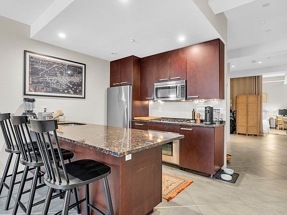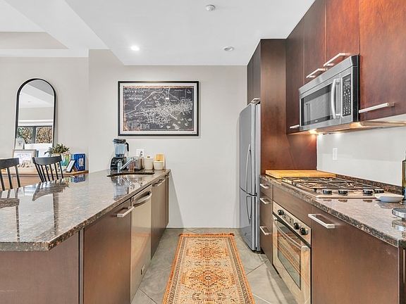 Corner exposure and two direct access outdoor spaces distinguish this oversized loft style one bed in professionally managed Gateway Terrace. Open concept floor plan and chef's kitchen with gas cooking, dakota mahoney granite counters, clean line, modern wood cabinetry and a breakfast bar that delineates the space. Your view from the sunny south facing private terrace extends beyond, to the quiet and massive professionally landscaped courtyard, replete with mature plantings, seating areas and a grilling station. The bedroom area can easily be enclosed and is lined with high-end closet and storage built-ins on one wall and a window/glass door system that opens to a second patio area on the other. Smartly tiled euro-bath has been retrofitted for handicapped access walk-in shower and also houses the unit's W/D. The privacy of a rarified setting delightfully contrasts with the bustle of the city as you step out onto the park-facing streetscape and take a short walk to just about anywhere.