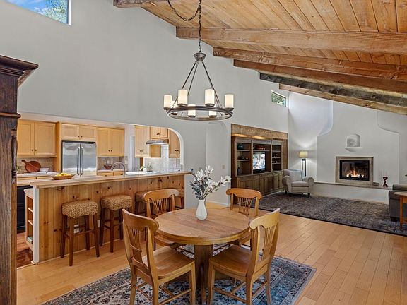 Kiva-inspired wood-burning fireplaceRich wood flooringExpansive oak-enclosed patioElegantly rustic pitched ceiling