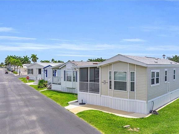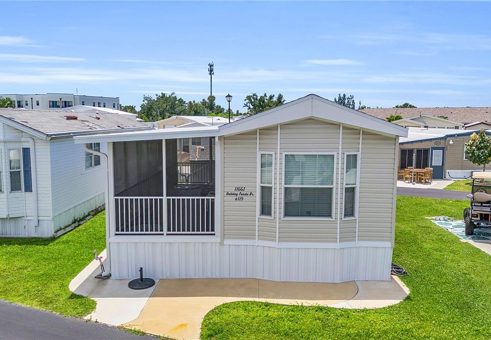 Welcome to Holiday Condo, an all-ages community in the heart of Fort Myers! This 1 bedroom, 1 bathroom manufactured home is a 2021 build and has a screened-in patio, plus 2 additional storage sheds. The HVAC system is lifted off the ground and sits on top of a concrete riser. Do not let the size fool you, there is plenty of cabinet space, and has a stackable washer/dryer inside as well. The home is elevated and did not have any interior water intrusion, the crawl space was damaged and professionally repaired. The community has 2 pools, 1 being indoor and 1 outdoor, plus a shared laundry area, playground, bocce ball, gated security, and more!