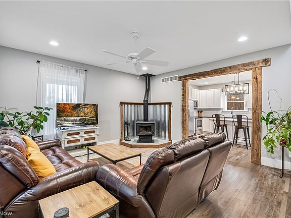 Presenting cozy, country living and endless possibilities with this custom Cape style home, BUILT IN 2017, on 13 PRIVATE ACRES in Medina County! The simplicity of the exterior sets the tone of the home, offering a comfortable & inviting space with tasteful modern farmhouse decor. The covered, wrap-around porch and the open, elevated back deck make great gathering places for family & friends and also peaceful spots for enjoying the beautiful scenery - including wooded and pond views! Step inside to find a neutral/bright color palette, tons of natural light, wood tones, and rustic accents throughout. The home has 4 bedrooms (including a first-floor master suite) and 3 FULL BATHS (with a 4th full bath already plumbed in the walkout basement!). You have a gorgeous and spacious eat-in kitchen with ample cabinetry, granite counters, a farmhouse sink, butcher block island, and sliding door to the back deck. The living room is adjacent to the kitchen and has a barnwood beam entryway, wood-burn