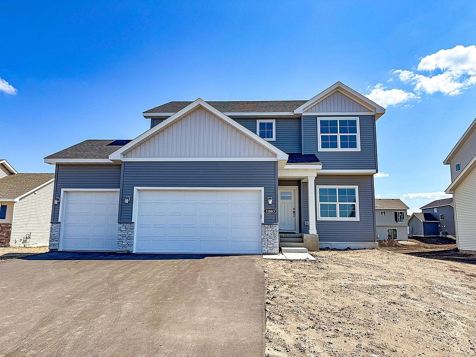 Move in NOW! Come experience the small-town charm of Hanover, MN in this super popular Brookview home in River's Edge! The Brookview plan offers over 3,000 square feet of beautifully designed living space with no community HOA. The expansive primary suite is a true retreat, featuring a spacious bedroom, a private spa-like bathroom complete with a free-standing soaking tub and a tiled shower, plus an enviable walk-thru closet that conveniently connects directly to the laundry room. The main level offers an open-concept design that seamlessly flows from the gourmet kitchen - complete with a stunning three-wall layout, designer vent hood, and built-in microwave - to the dining area and inviting living room. The living room is anchored by a gorgeous fireplace with shiplap extending to the ceiling, creating a warm, welcoming atmosphere. A quiet home office overlooks the front yard, providing the perfect setting for productivity. The fully finished basement adds nearly 800 square feet of additional living space, offering a large recreation room, a 5th bedroom, and a 3/4 bathroom, perfect for guests or family entertainment. A three-car garage is complemented by an extra workshop bump back, ideal for projects, hobbies, or additional storage. This amazing Brookview is located near beautiful parks, popular eateries, and the highly regarded Buffalo-Hanover-Montrose schools. River's Edge families can also Open Enroll into STMA schools. Don’t miss out on this rare opportunity to live in a peaceful, close-knit community with all the space and amenities you’ve been looking for - schedule your visit today!