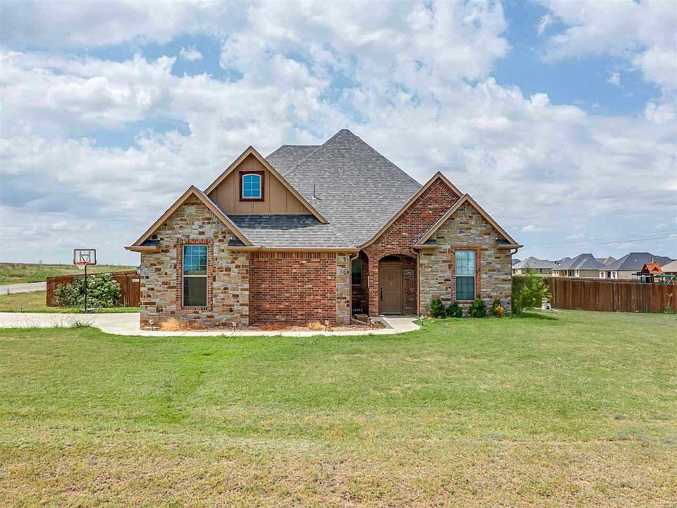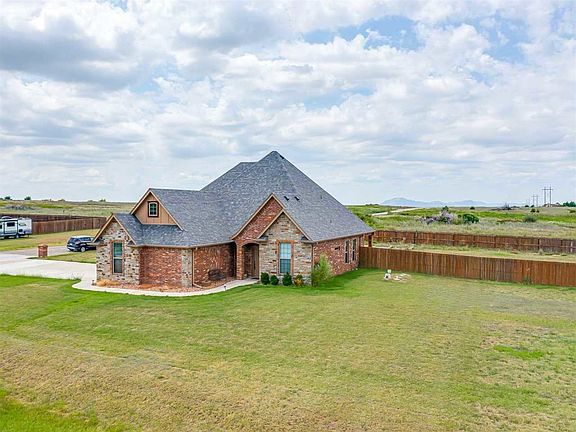 This sophisticated 5-bedroom, 3-bathroom residence is perfectly situated on a spacious corner lot. Step inside to find immaculate craftsmanship with wood cabinetry that flows throughout the home that also includes a perfectly curated built in wood hutch in the kitchen to display your favorite dishes or decor. The open-concept living spaces produce natural light, ideal for both daily living and entertaining. This home is energy efficient with natural gas heat, hot water heater, a cozy gas fireplace, and a range. Across from the spacious pantry will be a Washer & Dryer room with wood cabinets for storage and does include both washer and dryer. Downstairs, the primary bedroom has space for a King size bed and the bathroom suits plenty of storage with double sinks, a soaker tub, walk-in shower, water closet and a walk-in closet. The expansive upstairs SE room offers versatility, easily doubling as a bright and airy playroom, a personal gym or a quiet home office. You will find plenty of storage solutions throughout the home, including generous closets and dedicated areas for all your needs. This property is a must-see! The large lot provides ample outdoor space for relaxation or play that also includes a storm cellar and views of the Wichita Mountains! This home perfectly blends functional features with elegant charm. Your perfect home awaits! Schedule your private viewing today! Reach out to Listing Agent, Lexia Morre @ 580-514-7968 for more information!