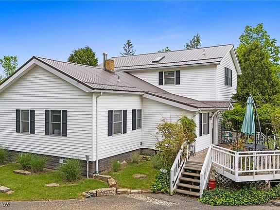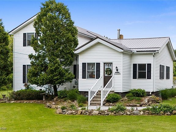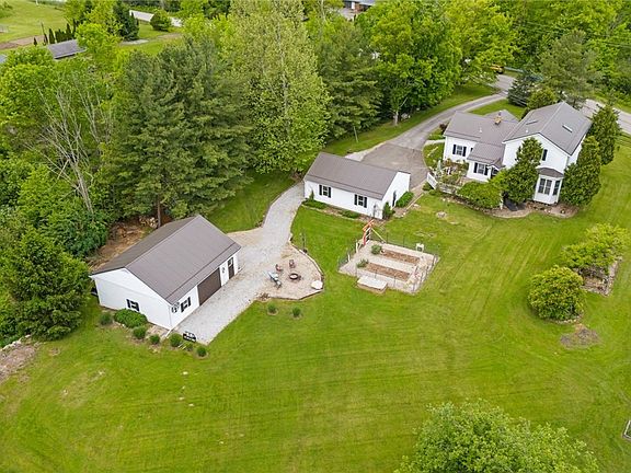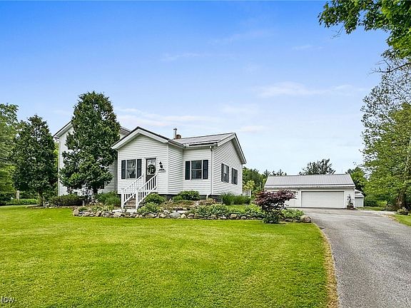 Charming Farmhouse with modern touches nestled on 2+Private Park-like Acres! Well-designed and remodeled over the years with sellers craftsmanship and care inside and out. Front entry welcomes you into this spacious home with over 2200 sqft of living space, 3 Bedrooms, 2 Full Baths and hardwood floors throughout. Open concept Living/Family Room with pellet stove for additional heat source. Dining Room with wood burning stove is open to Eat-in Kitchen with granite counters & all appliances stay. 2 Bedrooms on first floor & full guest bath. Follow the rustic staircase with wooden branch spindles up to the spacious Owner's Suite with skylights, walk-in closet plus 2 additional closets, bonus room ideal for nursery/office & french doors to Private Bath with jetted tub & separate shower. Back entry Mudroom with large storage closet & pantry. Full unfinished basement in original part of home includes laundry area plus 1997 addition with 12-course basement w/glass block windows, ideal for you to finish for Rec Room or use for great storage space. New metal roof on home installed in 2020 & both garage & shop roofs replaced in 2021. New well pump 2024, updated electrical & generator hookup. Central air. Manicured grounds and beds, this home is surrounded by mature trees for privacy...Relax on the deck or patio overlooking beautiful backyard with enclosed raised bed garden area. Paved driveway, 3+car detached garage & 30x26 Outbuilding/workshop. This well maintained home is ready for a new family to enjoy for years to come! Just steps away from Punderson State Park & Manor. 1-yr Home Warranty. West Geauga Schools.