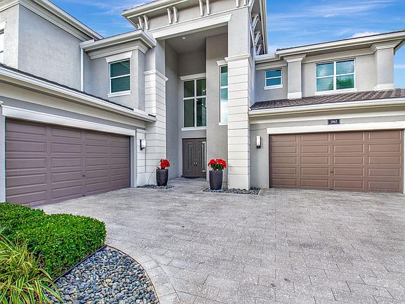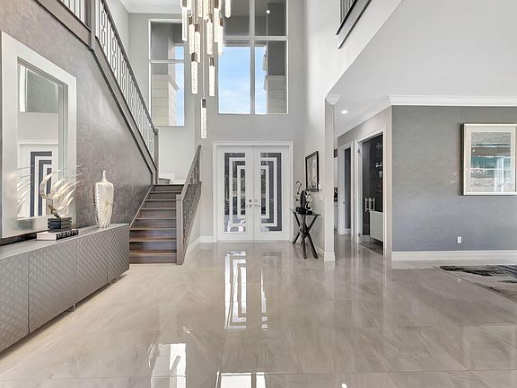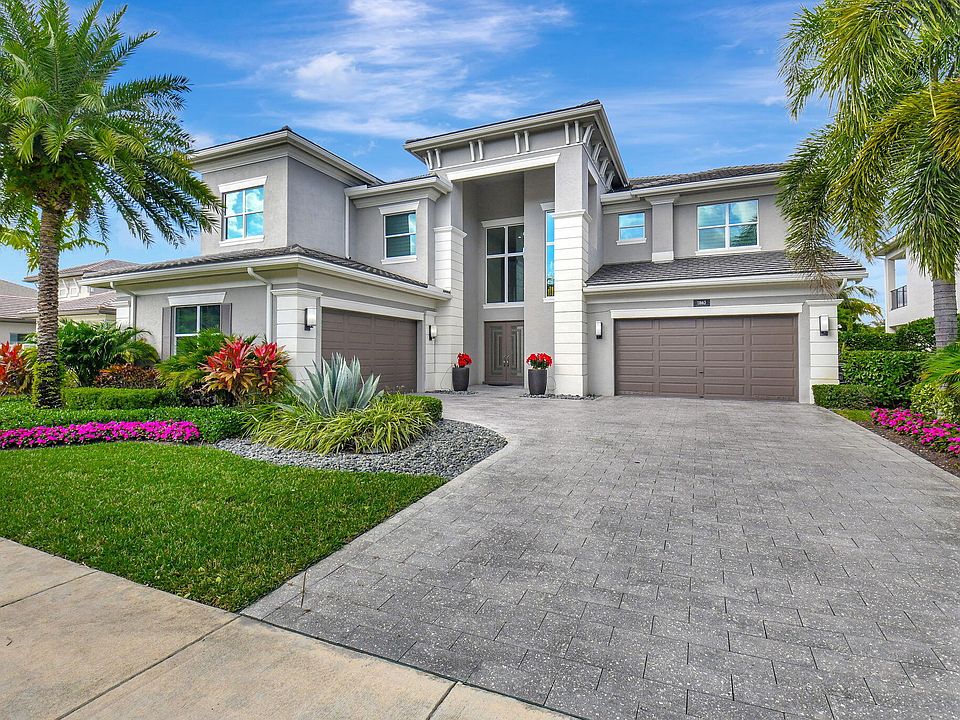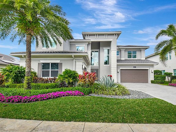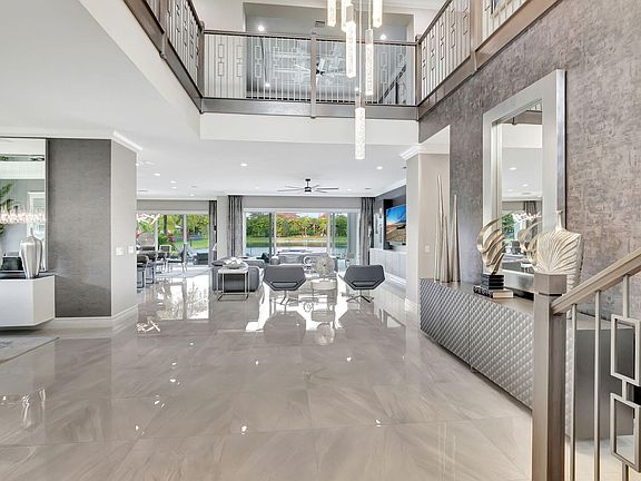 Enter into elegance with this Riverside model home, featuring superb upgrades and a breathtaking entrance with porcelain flooring. Situated on the best lot in Berkeley, this home offers a full waterfront view with five bedrooms and five-and-one-half baths. On the first level enjoy a regal dining room, a guest room with an ensuite, chef's kitchen equipped with a Sub-Zero refrigerator, Wolf gas cooktop, and a quartzite countertop on a huge island and dining area. Floor to ceiling glass enclosed wine rack. The family room boasts custom shelving, wallpaper, and accents. A customized tranquil club room features a full bar with amenities, custom seating, and remote-control shading. The outdoor area includes a summer kitchen with two grills, heated saltwater pool and spa, perfect for unwinding A stately wood staircase leads to four bedrooms, each with an ensuite, a loft with a built-in coffee bar, an exercise room, and office. The primary suite provides water views, remote shading, and custom closets. Primary bath is an oasis with soaking tub, elaborate shower, numerous cabinets, and continued elegance. Large laundry with high-end washer/dryer and cabinets upstairs. All wood flooring upstairs. Feel secure with all impact windows, full house generator and mosquito misting system in the back. Custom window treatments in every room, and 2 zone a/c system. Community has tennis court, basketball court and fitness center in the community. Close to shopping (Boca Raton Town Center Mall and Mizner Park), numerous restaurants, and short distance to the beach. This home is a must-see!